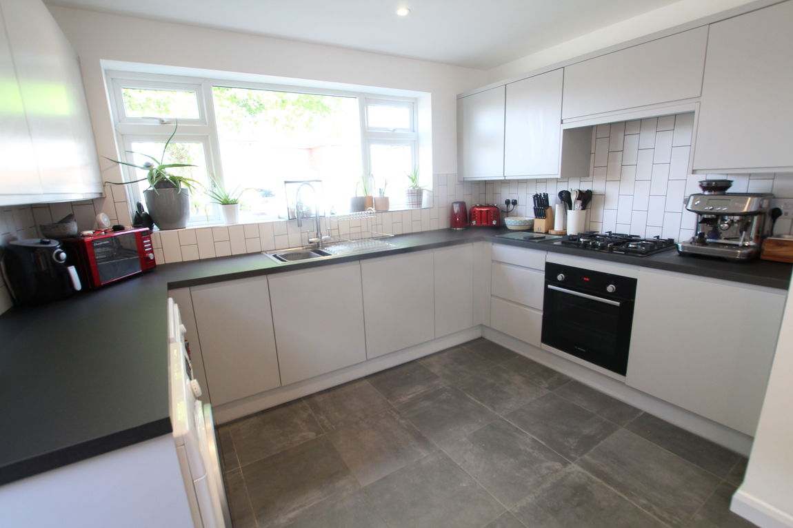 Dual aspect room with uPVC double glazed windows to front and side elevations, uPVC double glazed side door to driveway, double panel radiator, extensive modern refitted kitchen comprising of single drainer stainless steel sink unit with mixer tap over, modern work surfaces, range of base units incorporating built-in stainless steel Bosch gas hob and Bosch electric oven, plumbing for dish washer, plumbing for washing machine, built-in fridge, built-in freezer, tiling to splash areas, matching range of wall mounted units incorporating extractor hood, ideal area for table and chairs, tiled floor.