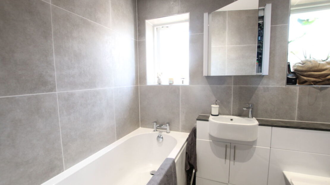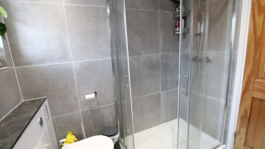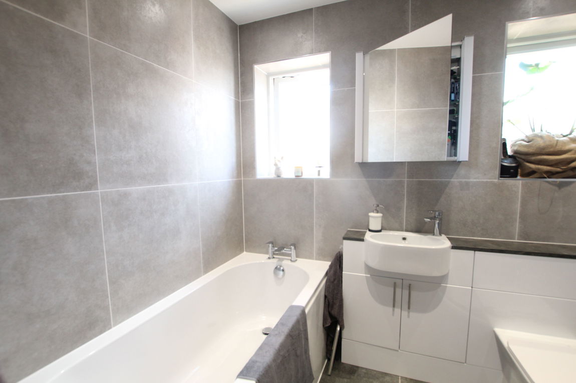 Refitted luxury fully tiled bathroom with uPVC obscure double glazed window to side elevation, vertical towel rail/radiator, four piece suite comprising of low level W.C, wash hand basin, panel bath with mixer tap over, separate shower cubicle with watering can style shower over plus second rinsing attachment, tiled floor, access to loft space.