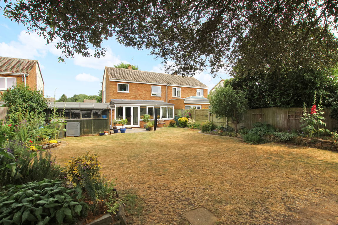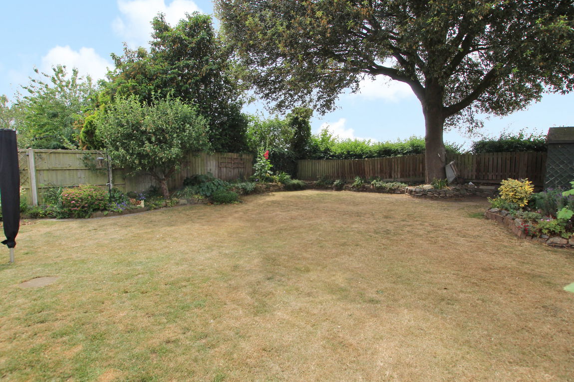 Established well stocked rear garden backing onto open fields, lawn, paved patio, timber garden store/shed to rear plus 15’6 X 7’8 timber shed.
