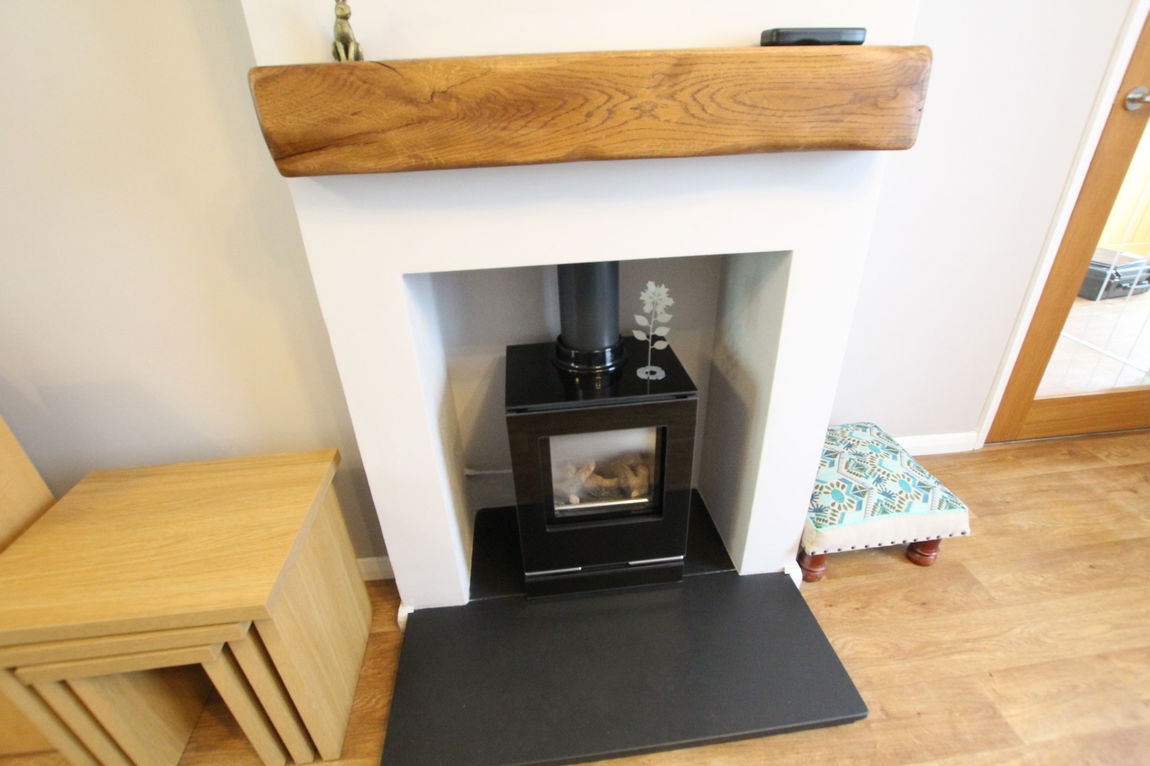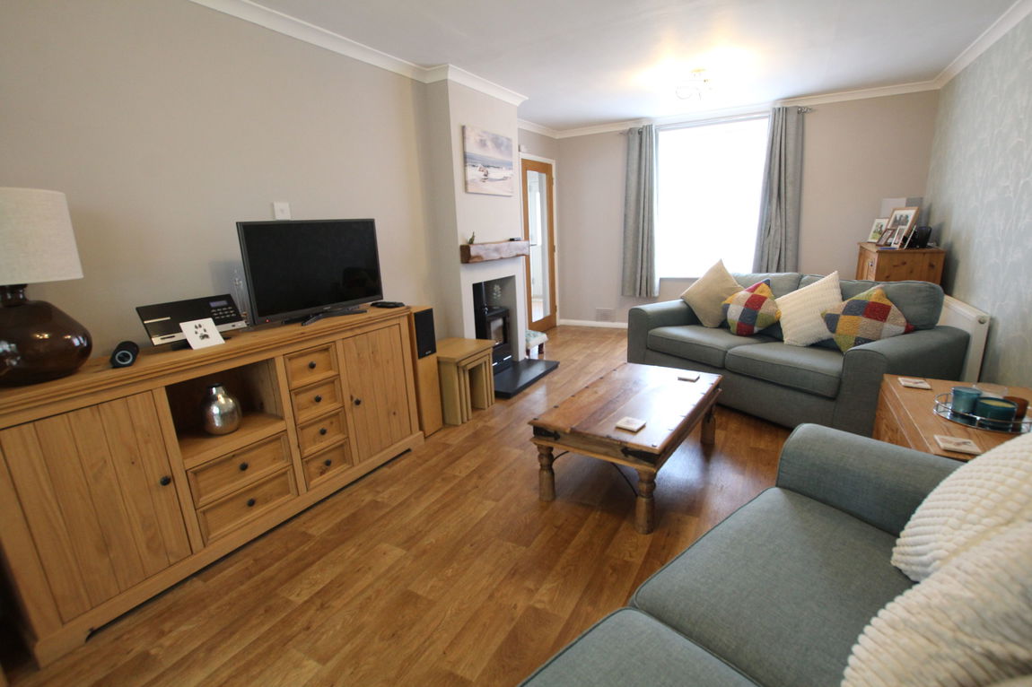 Dual aspect room with uPVC double glazed window to front elevation and uPVC double glazed patio door to rear elevation, feature inset wood burner style ‘living flame’ gas fire, two single panel radiators, wood effect flooring, coving to ceiling.