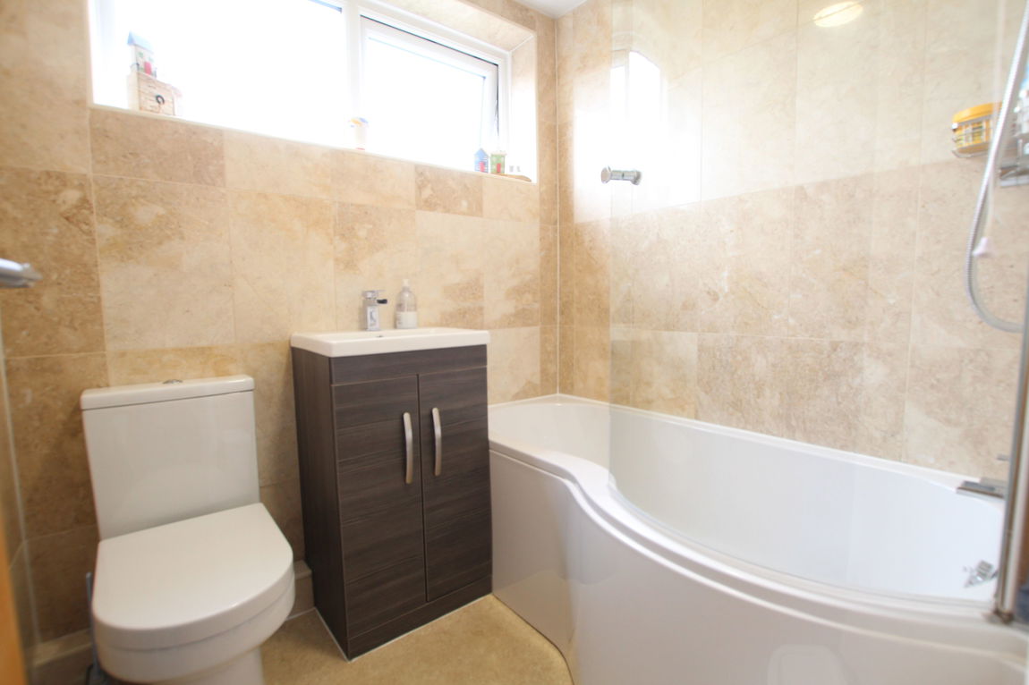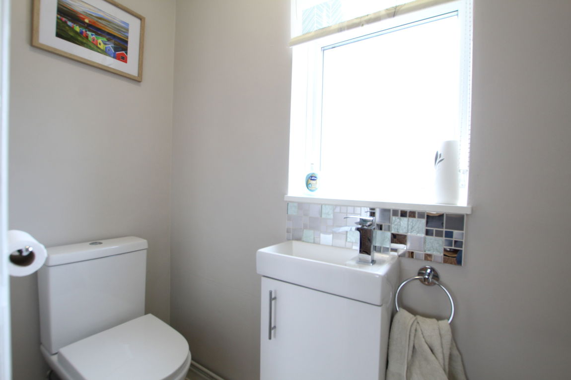 uPVC obscure double glazed window to side elevation, refitted two piece suite comprising of low level W.C, wash hand basin, tiling to splash areas, coving to ceiling.