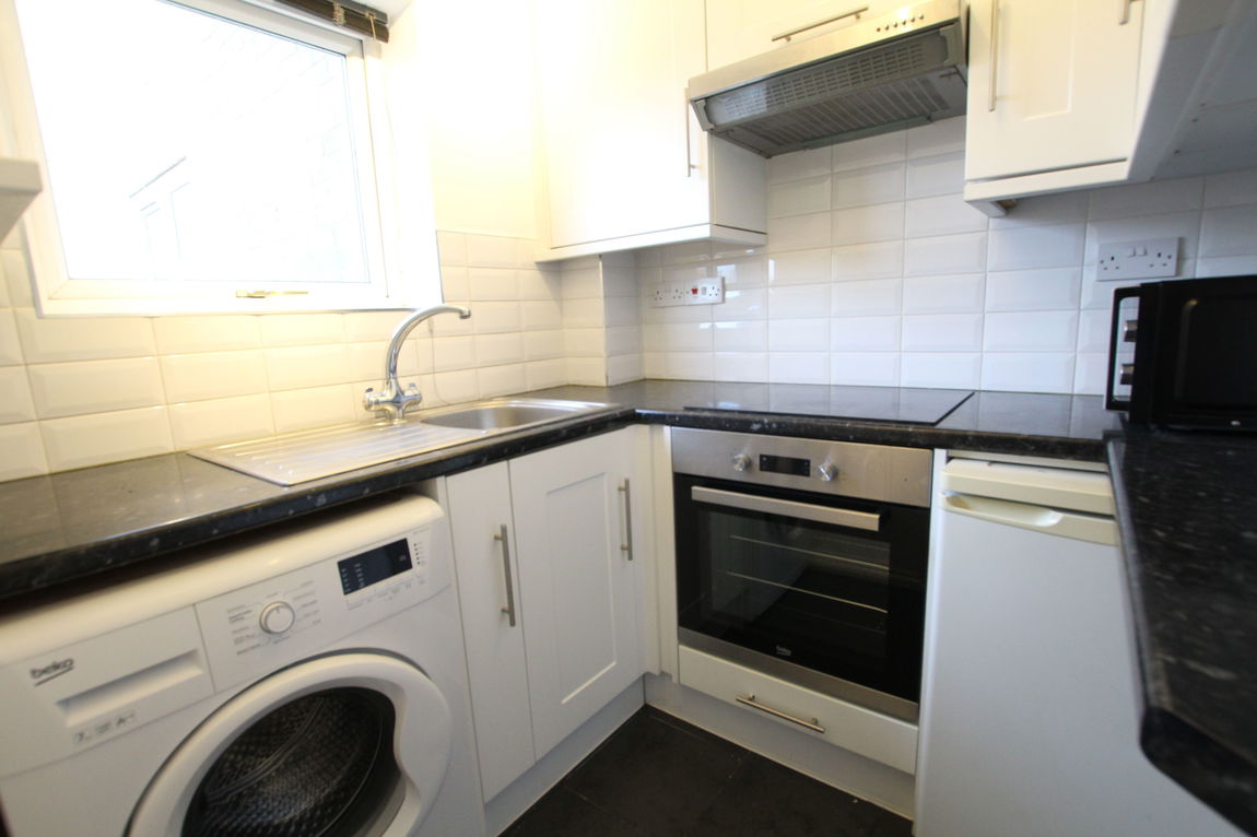 uPVC double glazed window to side elevation, modern fitted kitchen comprising of single drainer stainless steel sink unit with mixer tap over, roll top work surfaces, base units incorporating built-in electric hob and electric stainless steel oven, Beko washing machine, white fridge, matching range of wall mounted units incorporating stainless steel extractor hood, fitted single breakfast bar, tiled floor.