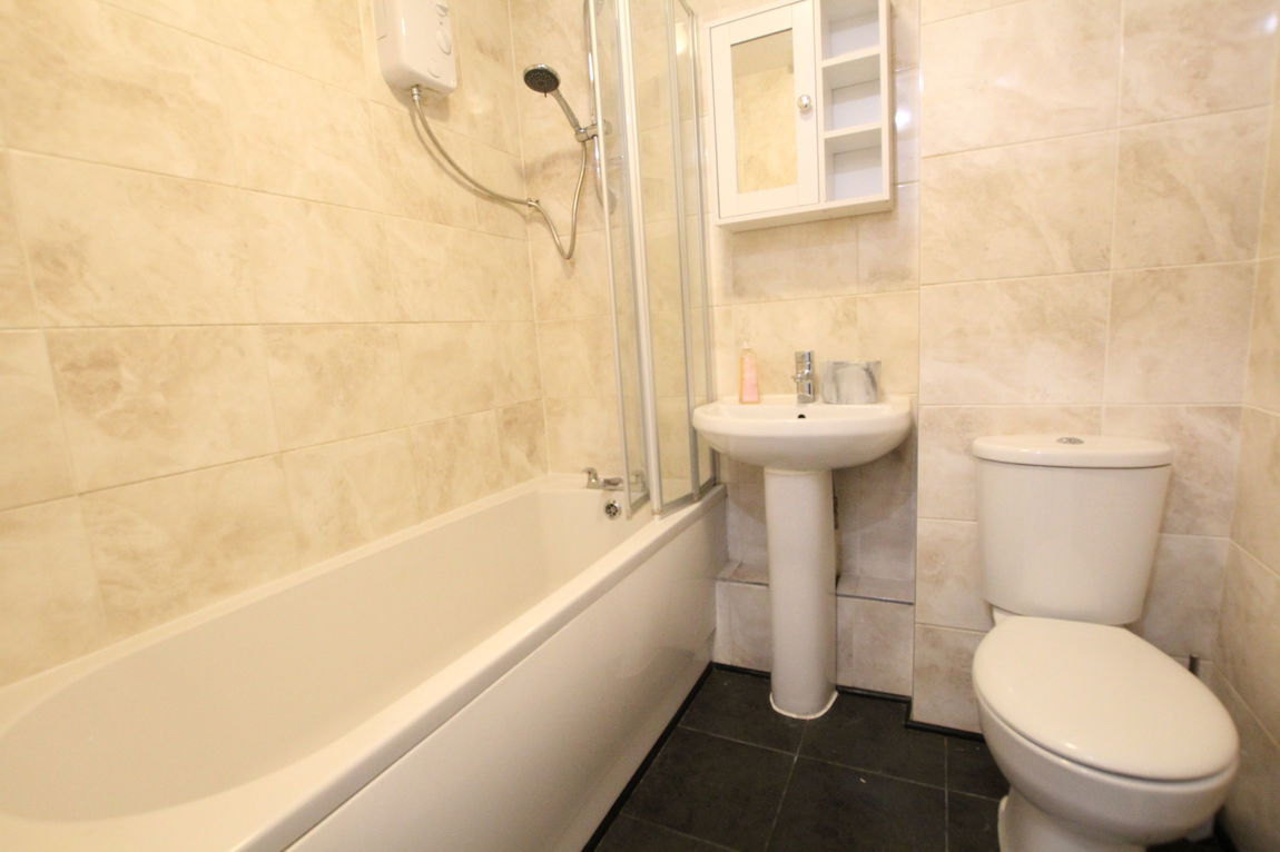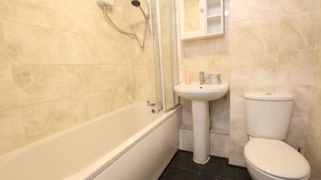 Fully tiled refitted modern bathroom with three piece suite comprising of low level W.C, wash hand basin, panel bath with mixer taps over and separate shower over with folding screen door, tiled floor, extractor fan, wall mounted electric fan heater.
