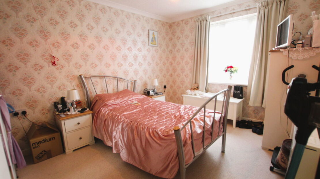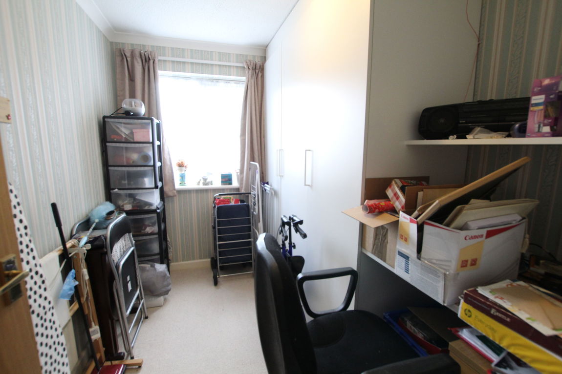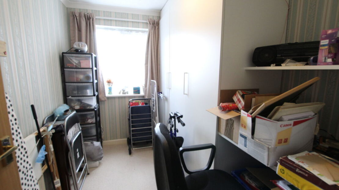 uPVC glazed window to rear elevation, pull cord Warden alarm, wall mounted electric storage heater, three door fitted wardrobe with writing desk, coving to ceiling.