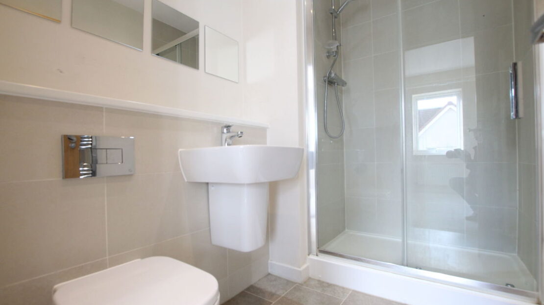 Chrome vertical towel rail/radiator, modern three piece white suite comprising of low level W.C, wash hand basin, fully tiled shower 1200mm cubicle.