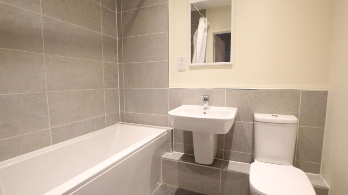 Chrome vertical towel rail/radiator, three piece suite comprising of low level W.C, wash hand basin, panel bath with shower/mixer taps over, tiling to splash areas.