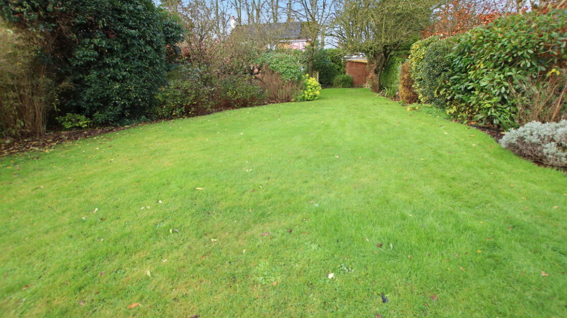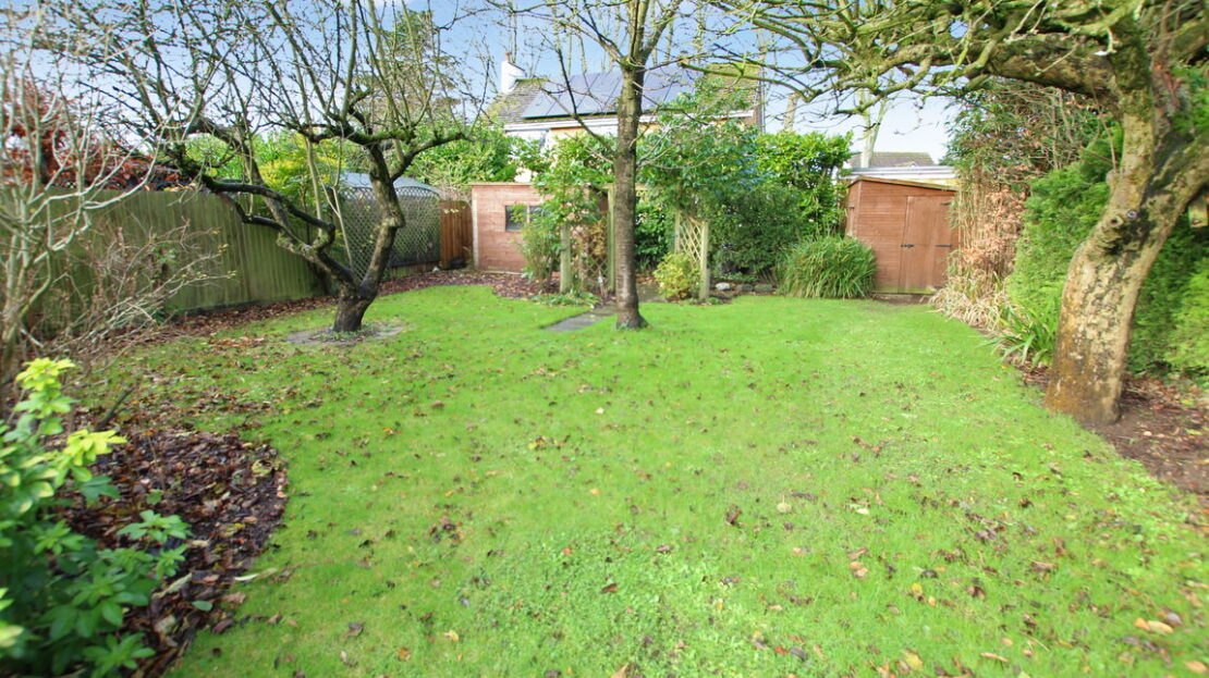 A generous and well screened mature rear garden reaching in excess of 100ft in length, mainly laid to lawn, extensive paved patio, two timber garden store/sheds at rear, side area with oil tank and gate to front.