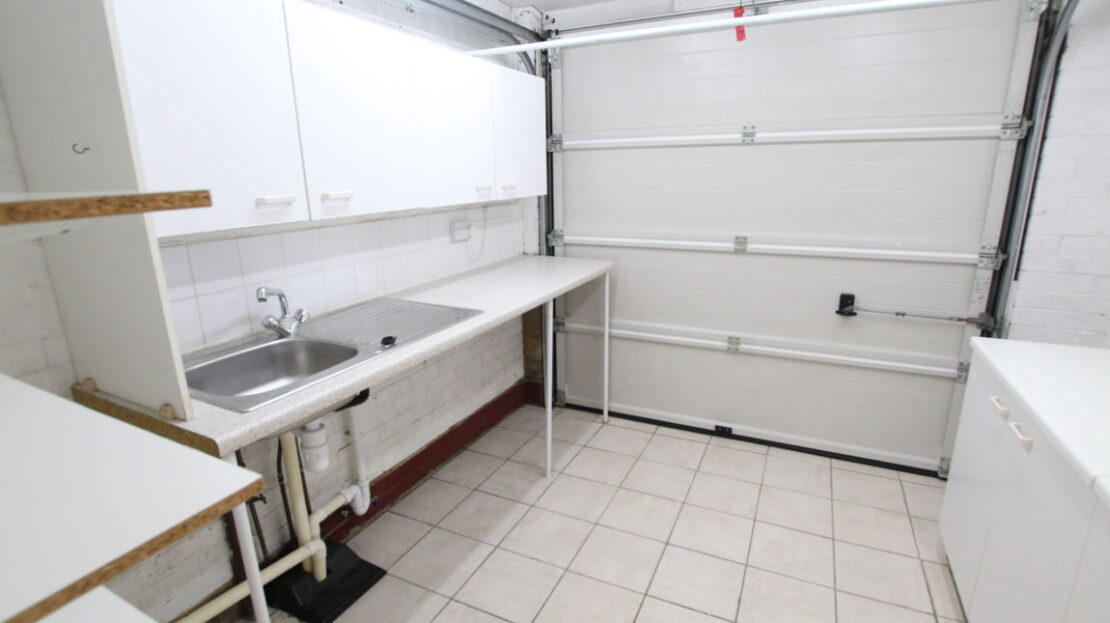 Created from front section of original garage still including the up and over door to access, base units incorporating single drainer stainless steel sink unit with mixer tap over, roll top work surfaces, plumbing for washing machine, space for tumble dryer.