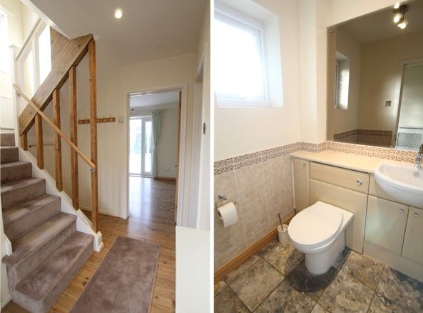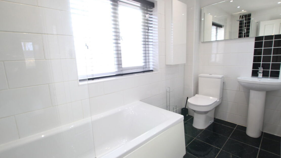 uPVC obscure double glazed window to front elevation, vertical towel rail/radiator modern refitted two piece modern white suite set into a vanity unit, comprising of low level W.C, wash hand basin, tiling to dado height plus tiled floor.