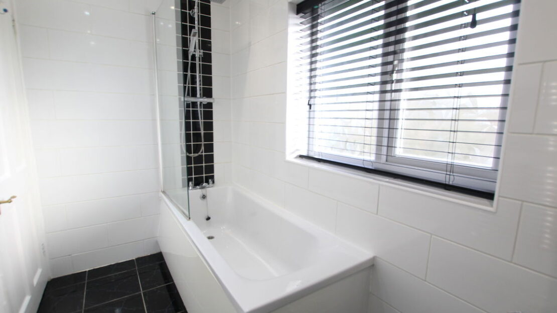 uPVC obscure double glazed window to rear elevation, chrome vertical towel rail/radiator, three piece suite comprising of low level W.C, wash hand basin, panel bath with shower/mixer tap over, watering can style shower head with second rinsing attachment, tiling to all elevations, built-in airing cupboard housing hot water tank and linen shelves.