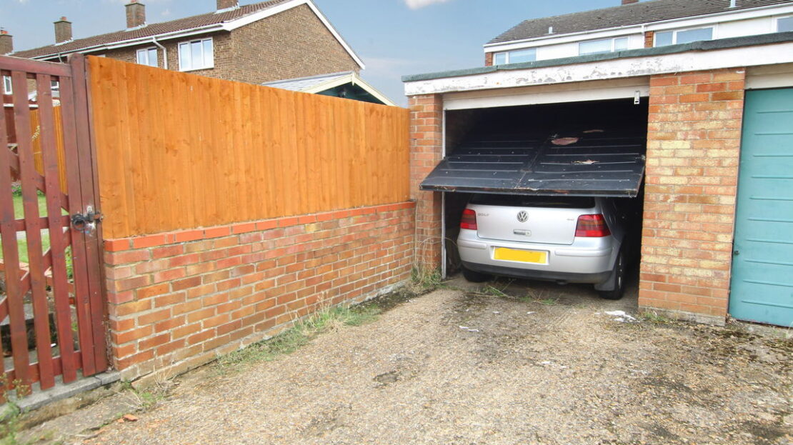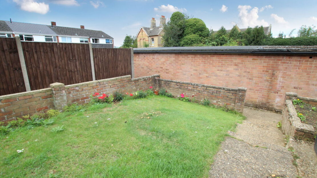 Open plan design mainly laid to lawn with pathway and access to rear garden.