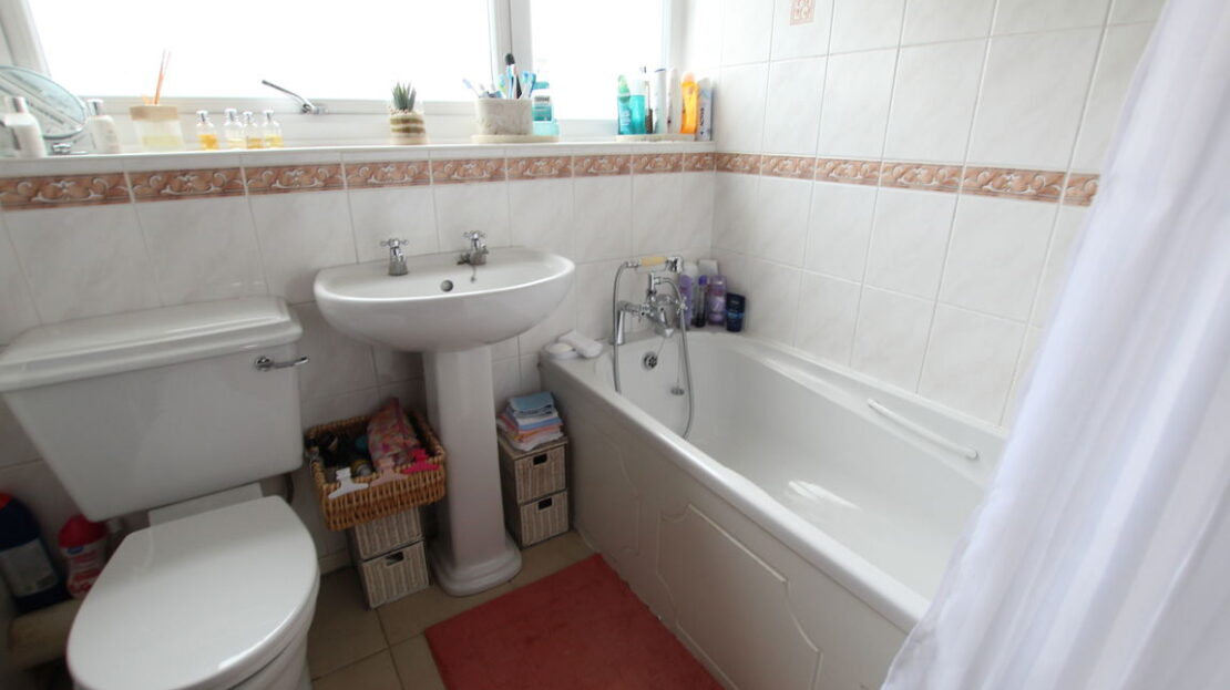 uPVC obscure double glazed window to rear elevation, chrome vertical towel rail/radiator, three piece suite comprising of low level W.C, wash hand basin, panel bath with shower/mixer tap over, tiling to splash areas.
