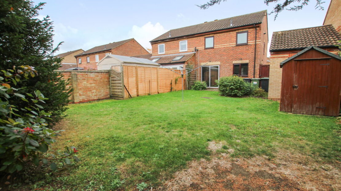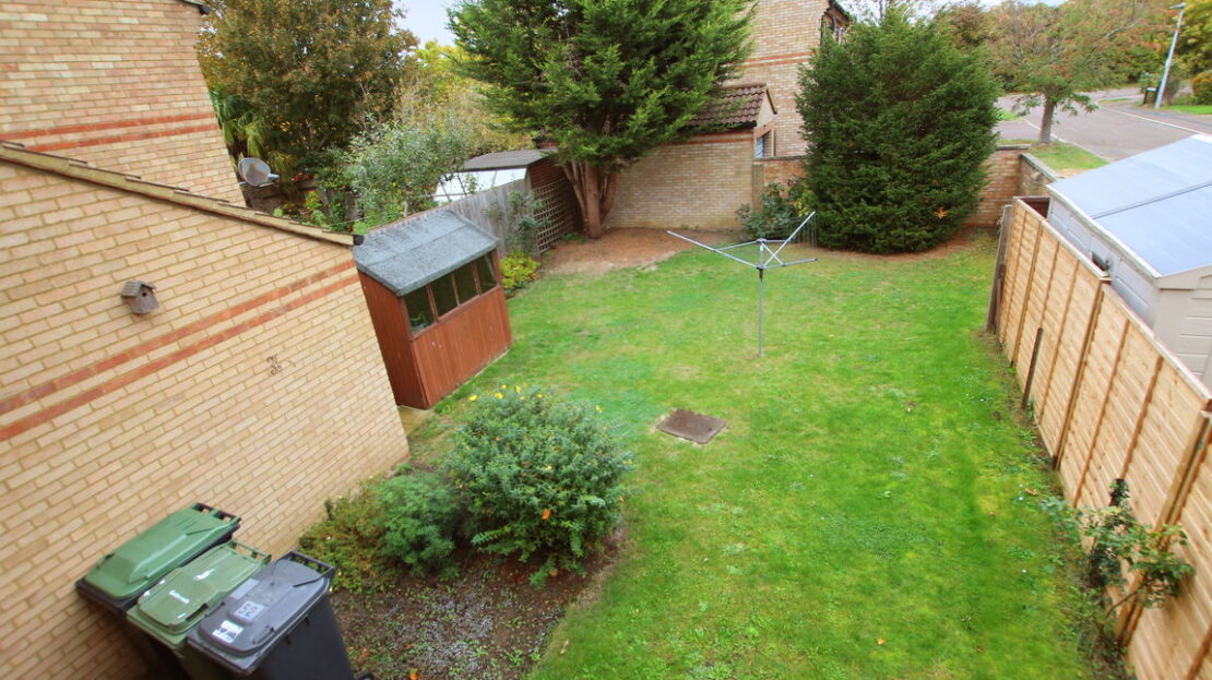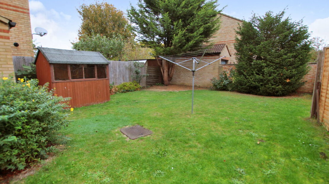 Approaching 50ft, mainly laid to lawn, paved patio, timber garden store/shed, enclosed by timber panel fencing and brick wall.