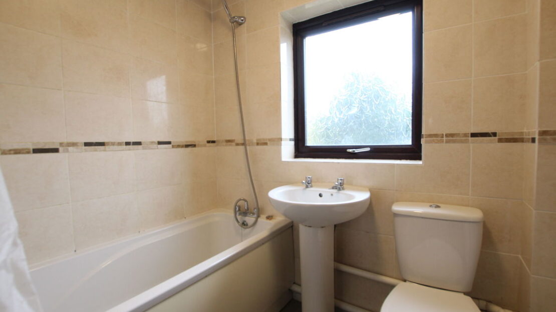 Fully tiled with uPVC obscure double glazed window to rear elevation, single panel radiator, three piece white suite comprising of low level W.C, wash hand basin, panel bath with shower/mixer tap over.
