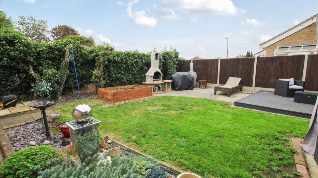 Mainly laid to lawn, paved patio, timber garden store/shed, decked area, enclosed by timber panel fencing.