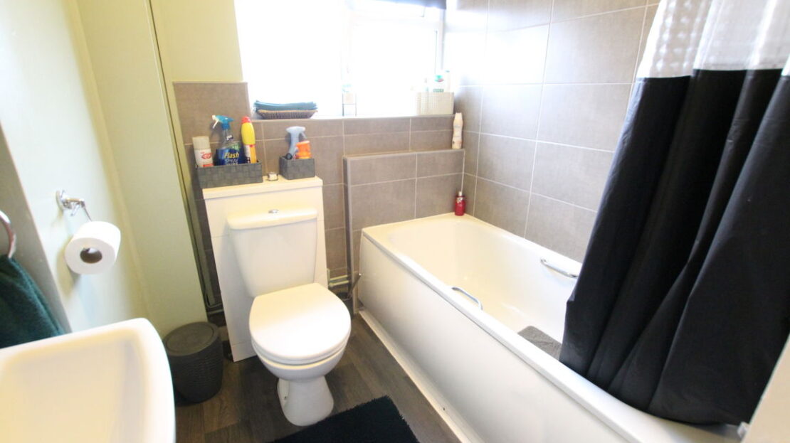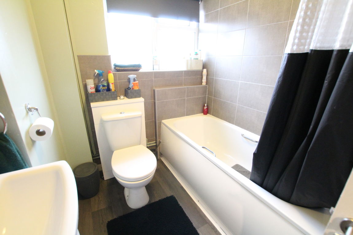 uPVC obscure double glazed window to front elevation, chrome vertical towel rail/radiator, three piece suite comprising of low level W.C, wash hand basin, panel bath with shower/mixer tap over, tiling to splash areas.